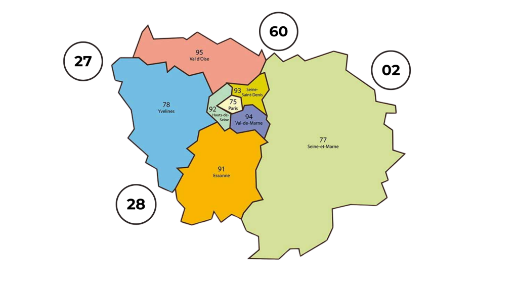 Paris (75) – Seine-et-Marne (77)– Yvelines (78)– Essonne (91)– Hauts-de-Seine (92)– Seine- Saint -Denis (93) Val-de-Marne (94)– Val D’Oise (95).
